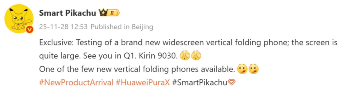بر اساس اطلاعات به اشتراک گذاشته شده در ویبو، غول فناوری چینی در حال حاضر مشغول آزمایش تاشوی عمودی جدید خود با صفحه نمایش عریض است. این افشاگر پیشنهاد میکند که این گوشی به طور آزمایشی برای ورود در سهماهه اول سال ۲۰۲۶ برنامهریزی شده است. این بازه زمانی، پنجره احتمالی عرضه را بین ژانویه تا مارس سال ۲۰۲۶ (دی ۱۴۰۴ تا فروردین ۱۴۰۵) قرار میدهد.