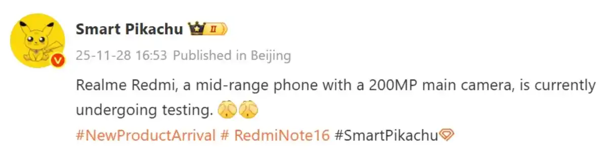 گزارش‌ها حاکی از آن است که شرکت ریلمی (Realme) در حال آماده‌سازی مقدمات برای عرضه سری جدید گوشی‌های هوشمند Realme 16 در چین است. لیست اخیر گواهی TENAA نشان می‌دهد که مدل ریلمی ۱۶ پرو به دوربین اصلی ۲۰۰ مگاپیکسلی مجهز خواهد شد. حال، افشاگر معروف دنیای فناوری، Smart Pikachu، مدعی شده است که رقیب مستقیم این سری، یعنی خانواده Redmi Note 16 نیز از همین رزولوشن دوربین بهره خواهد برد.