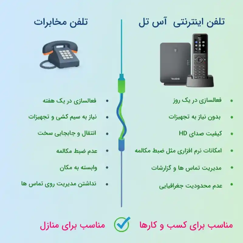 | امکانات اضافه | منشی گویا، صف انتظار، ضبط مکالمه، انتقال به موبایل، گزارشگیری لحظهای، کنفرانس، فکس ابری و… | فقط تماس ساده + در برخی موارد سانترال محدود |