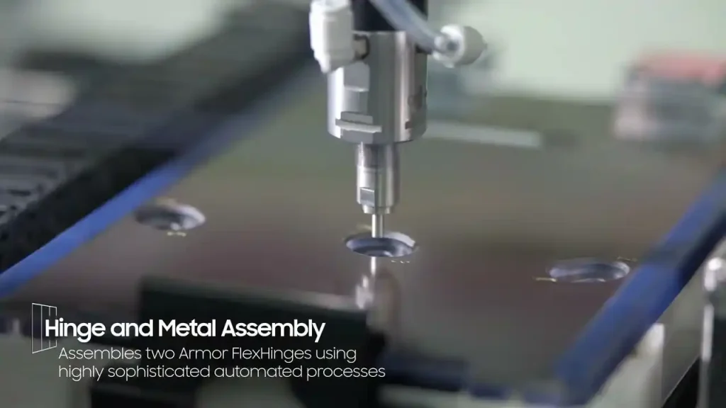 برای اطمینان از یکپارچگی سطح فریم، سامسونگ از یک روش جدید اتصال (Bonding) استفاده کرده و صاف بودن سطح را با اسکن لیزری دقیق تأیید میکند. پس از آن، پنل ۱۰ اینچی OLED تاشو به فریم متصل شده و برای مدت مشخصی تحت فشار قرار میگیرد تا ساختار نهایی نازکتر و مستحکمتر شود. همین روش فشاردهی برای اتصال صفحه پشتی به فریم نیز به کار میرود که دوام کلی دستگاه را افزایش میدهد.