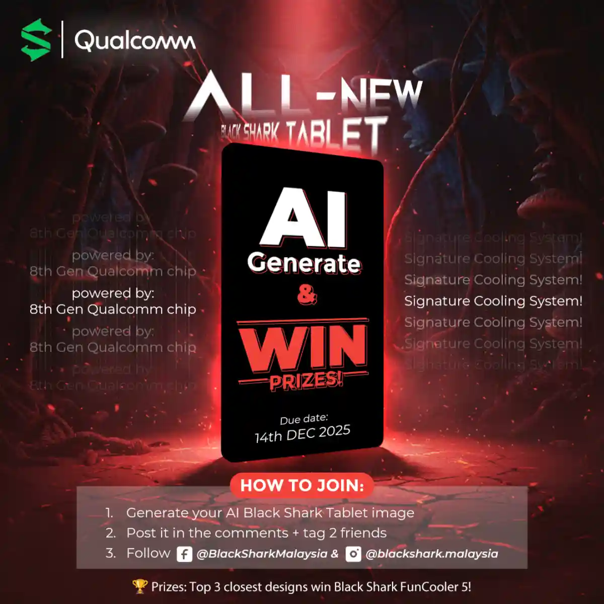 به سه نفر از برترین طراحان که طرحشان بیشترین شباهت را به محصول نهایی داشته باشد، فن خنک‌کننده Black Shark Funcooler 5 (به ارزش تقریبی ۴۰ تا ۵۰ دلار) اهدا خواهد شد. مهلت شرکت در این مسابقه تا ۲۳ آذر ۱۴۰۴ (۱۴ دسامبر ۲۰۲۵) تعیین شده است.