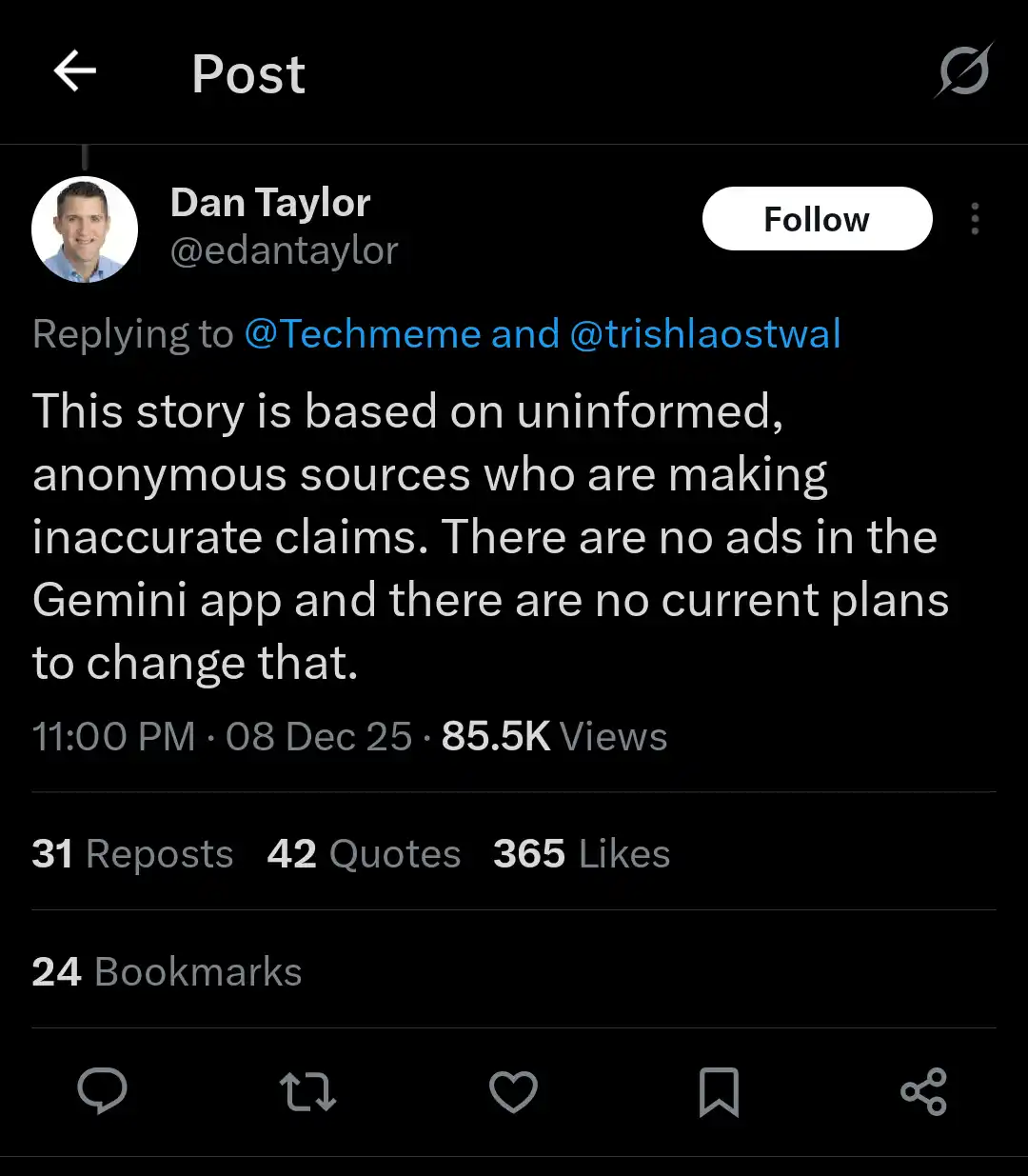 «این گزارش بر اساس ادعاهای نادرست منابع ناشناس و ناآگاه تنظیم شده است. هیچ تبلیغاتی در اپلیکیشن Gemini وجود ندارد و ما فعلاً هیچ برنامه برای تغییر این وضعیت نداریم.»