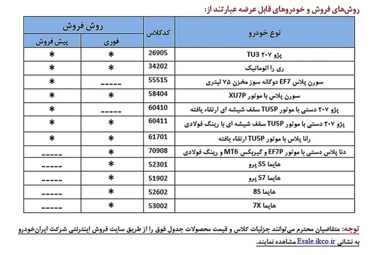 توجه داشته باشید که همه خودروها در هر دو روش عرضه نمیشوند. جدول زیر وضعیت فروش هر خودرو را نشان میدهد: