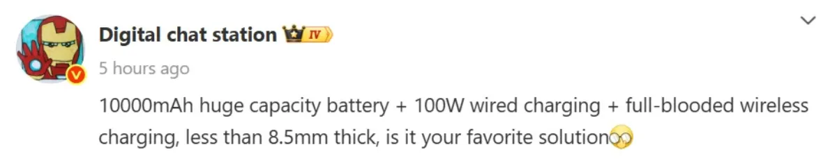 افشاگر معروف، Digital Chat Station، خبر از عرضه یک گوشی هوشمند جدید با ترکیبی خیرهکننده از باتری غولپیکر و طراحی باریک داده است. طبق پست او در شبکه اجتماعی ویبو، این دستگاه ناشناس که احتمال میرود ردمی K90 اولترا باشد، به یک باتری ۱۰۰۰۰ میلیآمپرساعتی، پشتیبانی از شارژ سیمی ۱۰۰ واتی و شارژ بیسیم پرسرعت مجهز خواهد بود و تمام اینها در بدنهای با ضخامت کمتر از ۸.۵ میلیمتر جای میگیرد.