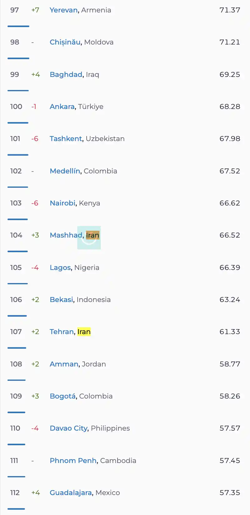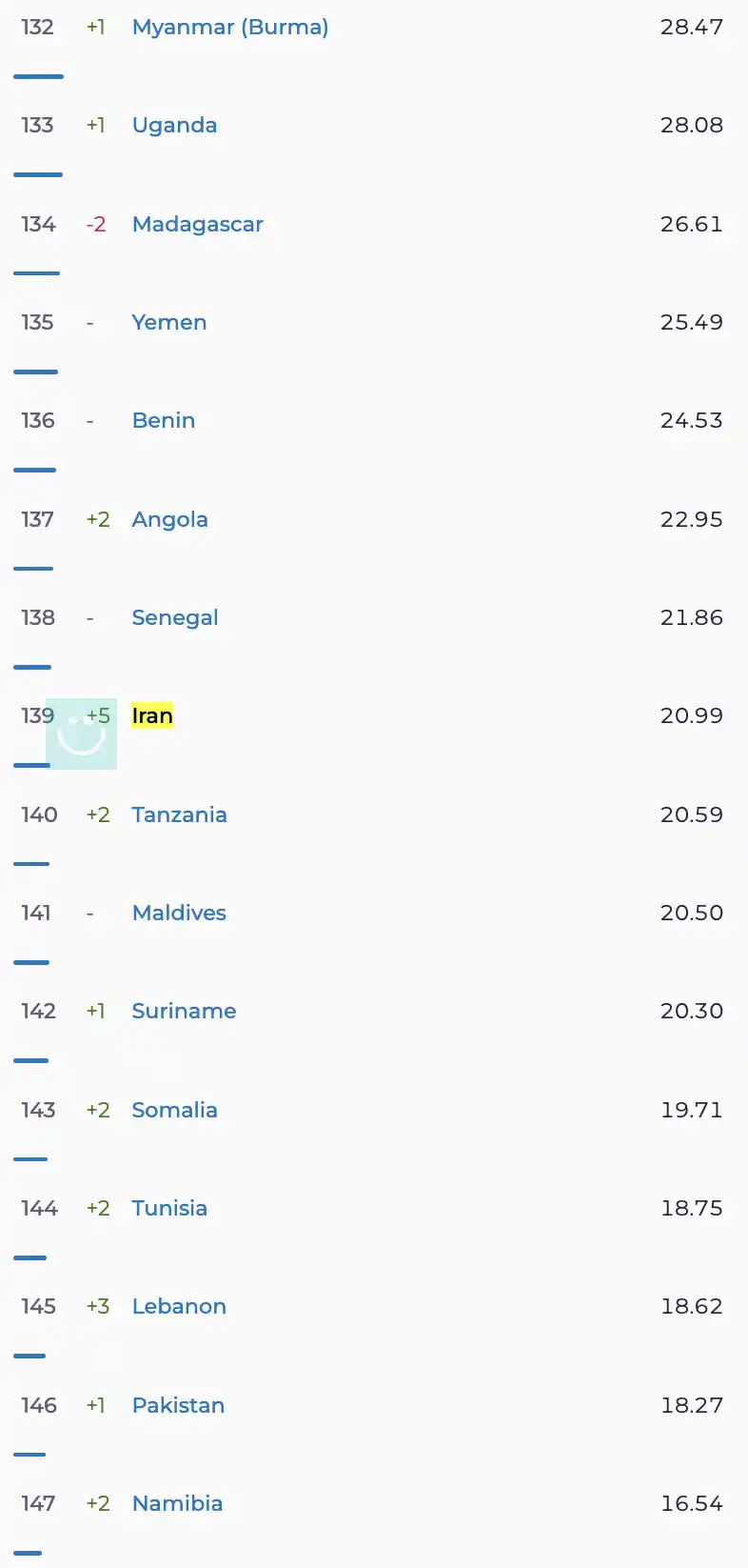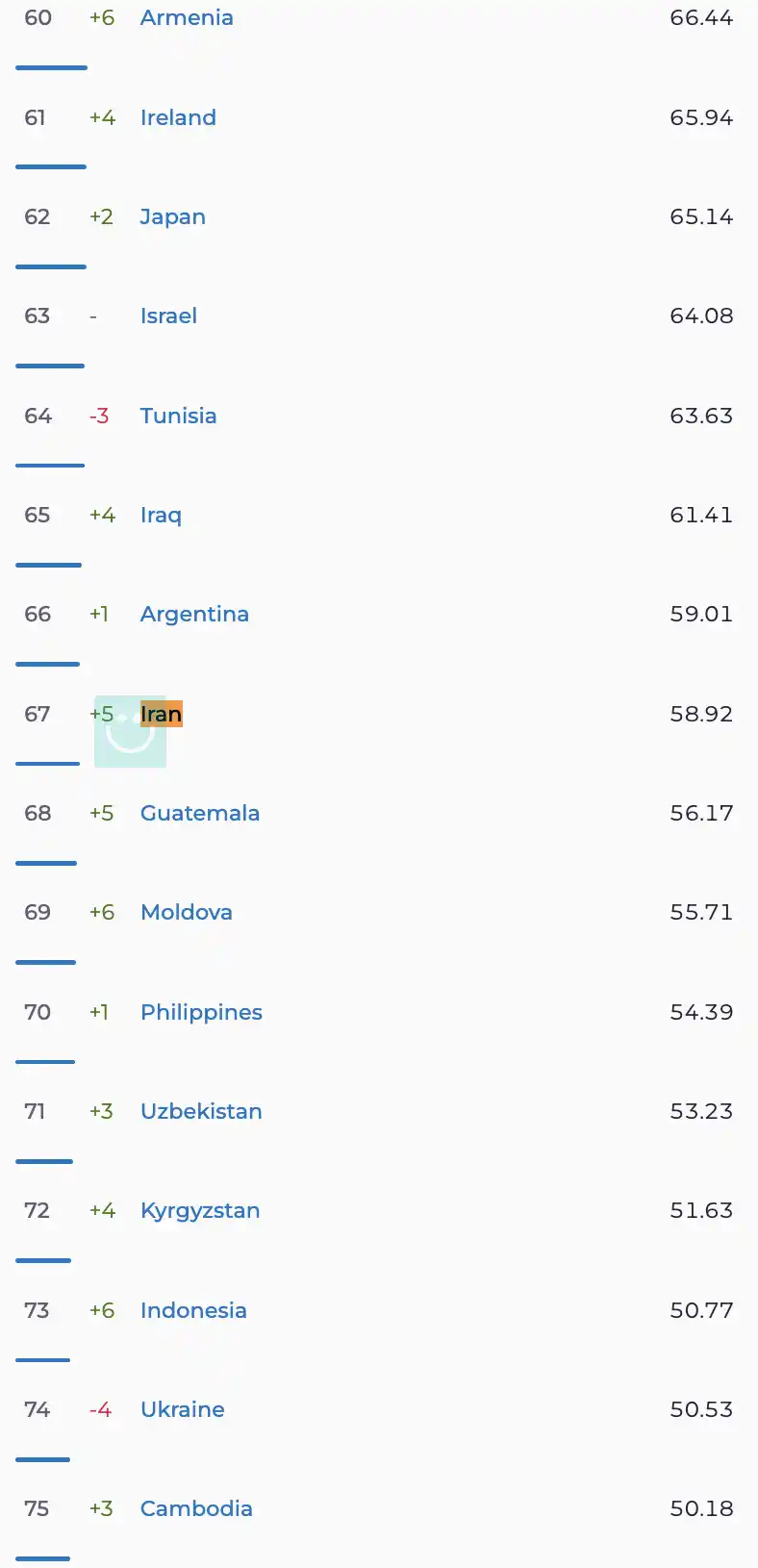 برای درک بهتر این جایگاه، بد نیست بدانید که در همسایگی ما، کشورهایی مانند ارمنستان (رتبه ۶۰) و عراق (رتبه ۶۵) همچنان بالاتر از ایران قرار دارند، اما ایران توانسته بالاتر از کشورهایی مثل گواتمالا و فیلیپین قرار بگیرد.