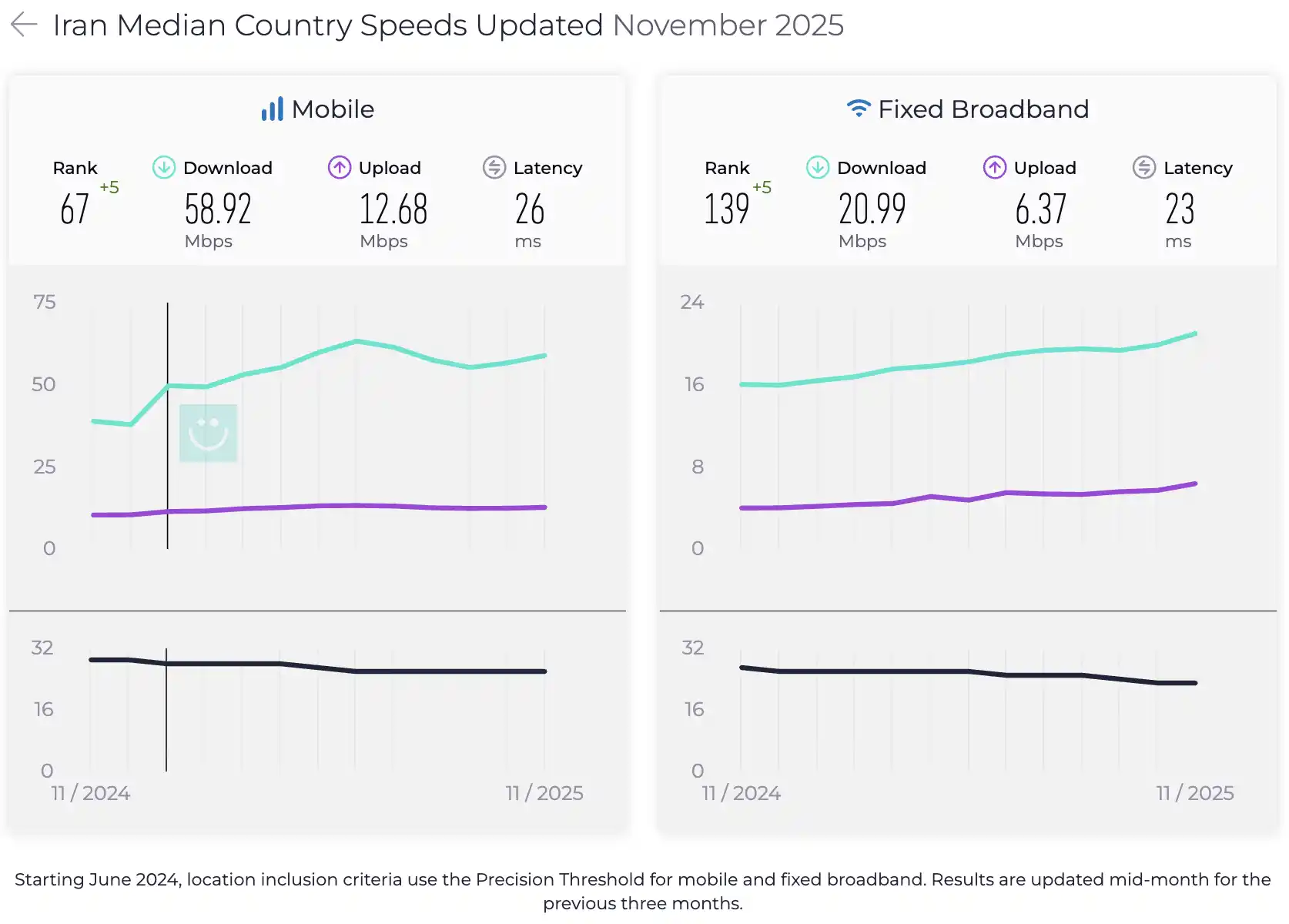 وضعیت اینترنت موبایل و ثابت ایران – گزارش آذر ۱۴۰۴ از مرجع Ookla – Speed Test