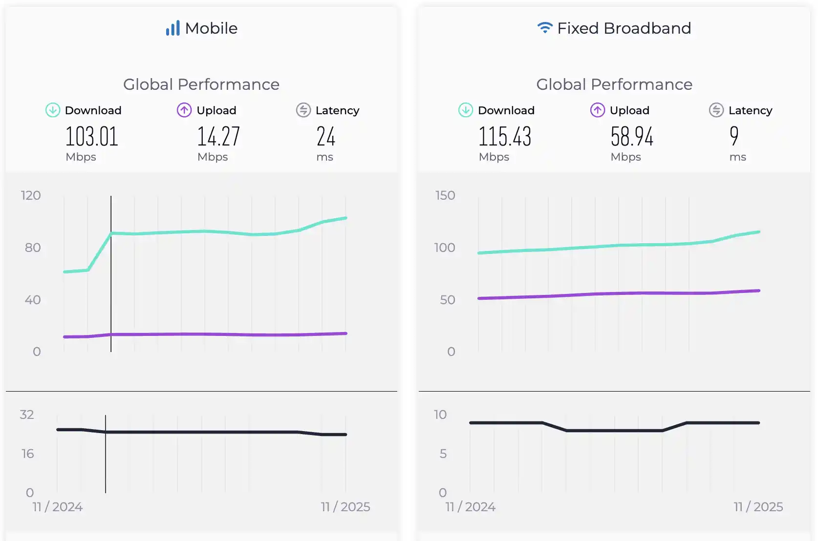 میانگین وضعیت اینترنت موبایل و ثابت جهانی – گزارش آذر ۱۴۰۴ از مرجع Ookla – Speed Test