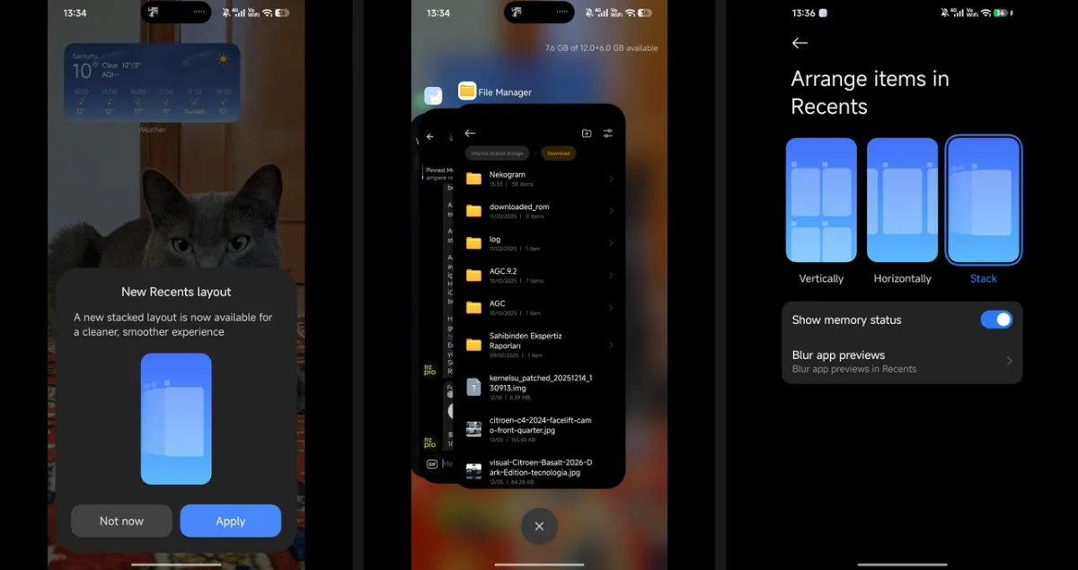 این رابط کاربری جدید برای بخش برنامههای اخیر، بهجای چیدمان سنتی تخت یا شبکهای، یک آرایش کارتی عمودی و پشتهای، کاملاً مشابه آنچه در سیستمعامل iOS اپل دیدهایم، به ارمغان میآورد. برای دسترسی به این طراحی جدید، ابتدا باید آن را از مسیر Settings > Recent Apps فعال کنید. در این بخش، امکان جابهجایی بین سبکهای مختلف این طراحی جدید نیز وجود دارد.