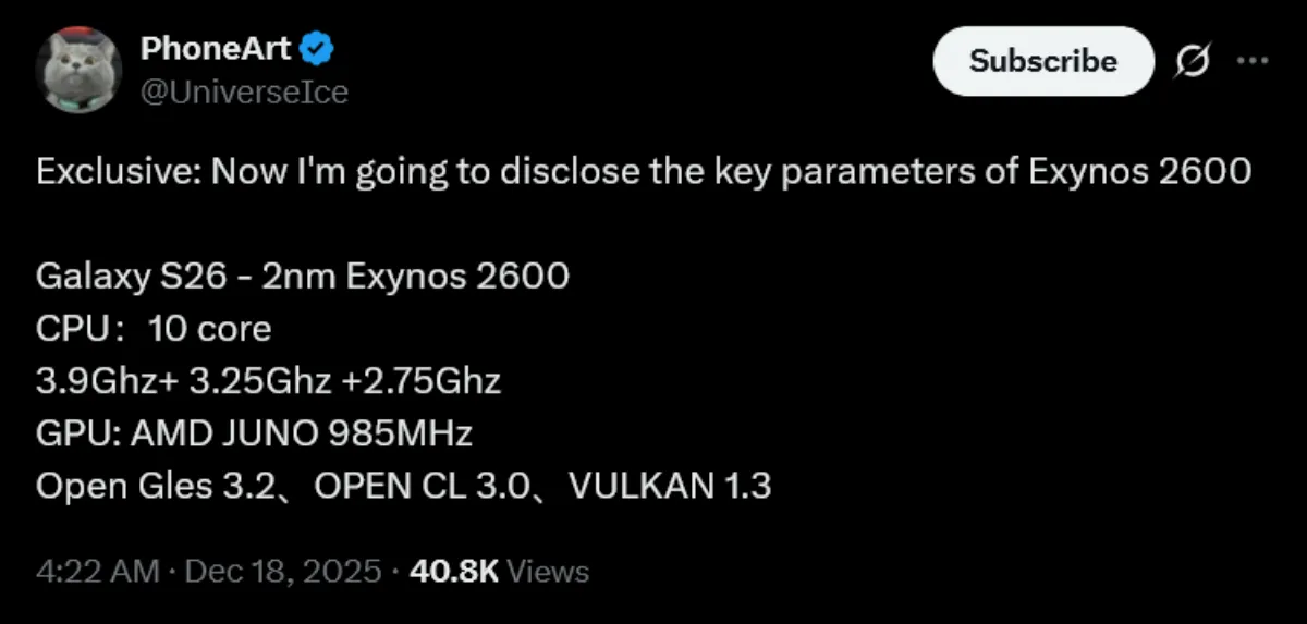 سامسونگ اخیراً از ورود پردازنده اگزینوس ۲۶۰۰ خبر داده بود و انتظار می‌رود این تراشه در برخی مناطق، قلب تپنده گوشی‌های گلکسی S26 و S26 پلاس باشد. اکنون، یک افشاگر معتبر جزئیات بیشتری را در مورد این تراشه منتشر کرده است.