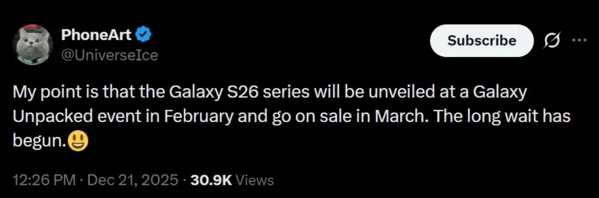 اگر این شایعه جدید دقیق باشد، این موضوع الگوی اخیر را که در آن شاهد رونمایی سری‌های گلکسی S24 و S25 در ماه ژانویه بودیم، می‌شکند. در عوض، به‌نظر می‌رسد سامسونگ می‌خواهد زمان عرضه را به کنگره جهانی موبایل (MWC) که از ۲ تا ۵ مارس (۱۱ تا ۱۴ اسفند) در بارسلونا برگزار می‌شود، نزدیک‌تر کند.