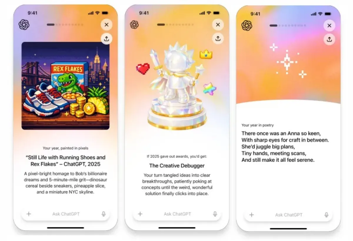 مانند ویژگی اسپاتیفای، OpenAI از گرافیک‌های جذاب استفاده می‌کند و با اعطای «جوایز» بر اساس نحوه استفاده شما از ChatGPT در طول سال، تجربه را شخصی‌سازی می‌کند. به‌عنوان‌مثال، اگر از چت‌بات برای یافتن راه‌حل برای یک مشکل یا کار بر روی یک مفهوم یا ایده استفاده کرده باشید، ممکن است جایزه «دیباگر خلاق» (Creative Debugger) را دریافت کنید.
