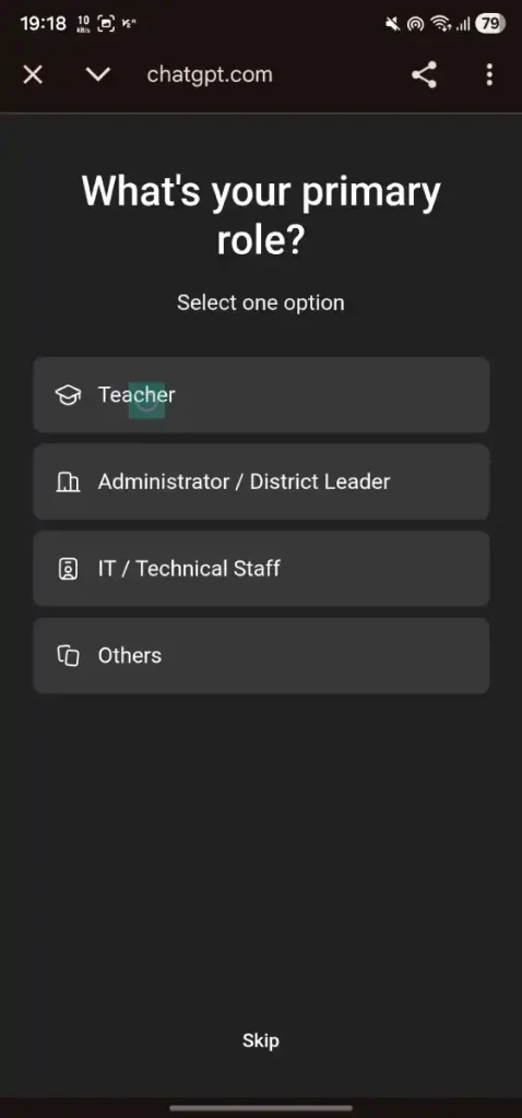 6. در مرحله تکمیل مشخصات، وقتی از شما شغل یا هدف استفاده پرسیده شد، گزینه Teacher (معلم) را انتخاب کنید.