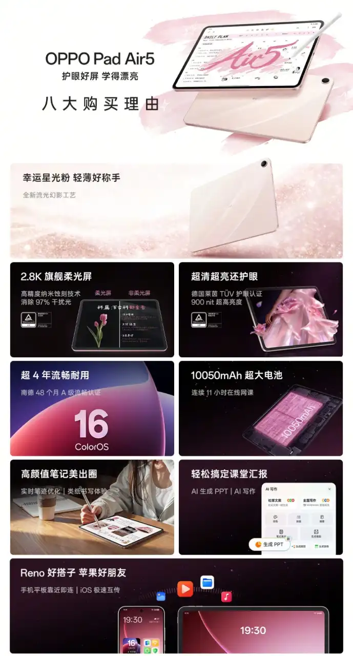 اوپو Pad Air 5 با جدیدترین رابط کاربری این شرکت، یعنی ColorOS 16.0 عرضه می‌شود. از دیگر ویژگی‌های مهم این تبلت می‌توان به موارد زیر اشاره کرد: