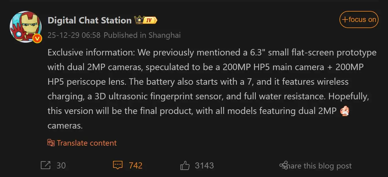بر این اساس، احتمال دارد این گوشی به سیستم دوربین دوگانه ۲۰۰ مگاپیکسلی مجهز شود. به این معنی که هم دوربین اصلی و هم دوربین تله‌فوتو از سنسور قدرتمند ۲۰۰ مگاپیکسلی (احتمالاً مدل HP5 سامسونگ) بهره خواهند برد. اگر این موضوع صحت داشته باشد، کیفیت زوم و جزئیات تصاویر در این گوشی جهش چشمگیری خواهد داشت.
