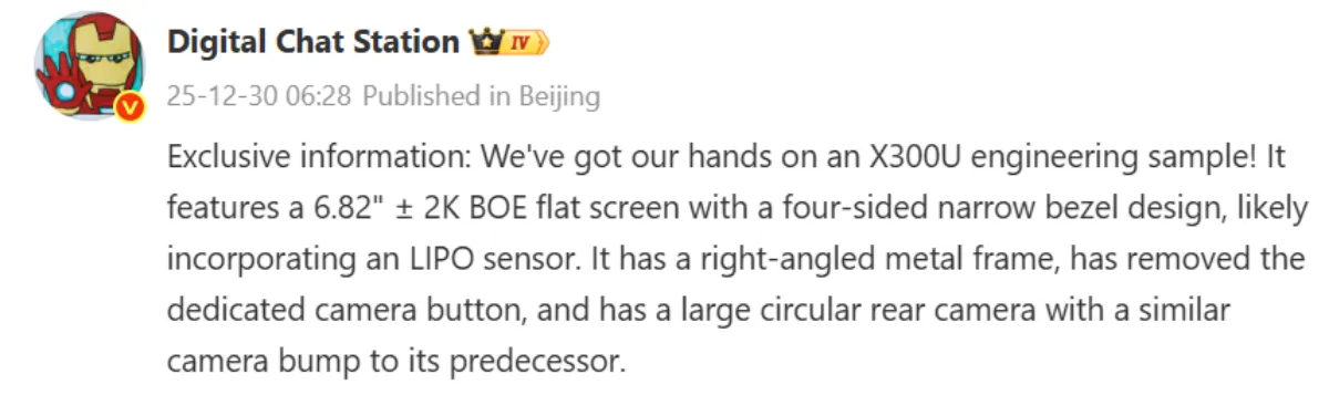 شایعات پیرامون پرچمدار آینده شرکت ویوو یعنی vivo X300 Ultra همچنان ادامه دارد و بهتازگی جزئیات دقیقی از طراحی و صفحهنمایش این دستگاه توسط افشاگر مشهور، Digital Chat Station، منتشر شده است. طبق این اطلاعات جدید، بهنظر میرسد که ویوو قصد دارد با تغییرات جسورانه در طراحی و ارتقای چشمگیر سختافزار، بهویژه در بخش باتری و دوربین، رقبای خود را در سال ۲۰۲۶ به چالش بکشد.