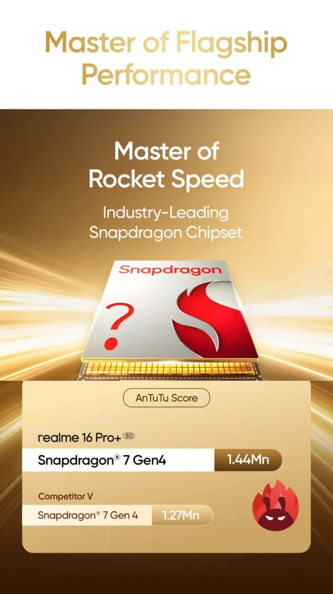 طبق اطلاعات رسمی، قلب تپنده +Realme 16 Pro را تراشه Snapdragon 7 Gen 4 تشکیل می‌دهد. ریلمی ادعا می‌کند که این پردازنده موفق شده است در بنچمارک آنتوتو امتیاز قابل‌توجه ۱.۴۴ میلیون را کسب کند که نشان‌دهنده عملکردی بسیار روان در اجرای بازی‌ها و برنامه‌های سنگین است. این پردازنده قدرتمند با ۱۲ گیگابایت حافظه رم از نوع LPDDR5X و ۵۱۲ گیگابایت حافظه داخلی همراه شده تا کاربران هیچ نگرانی بابت سرعت و فضای ذخیره‌سازی نداشته باشند.