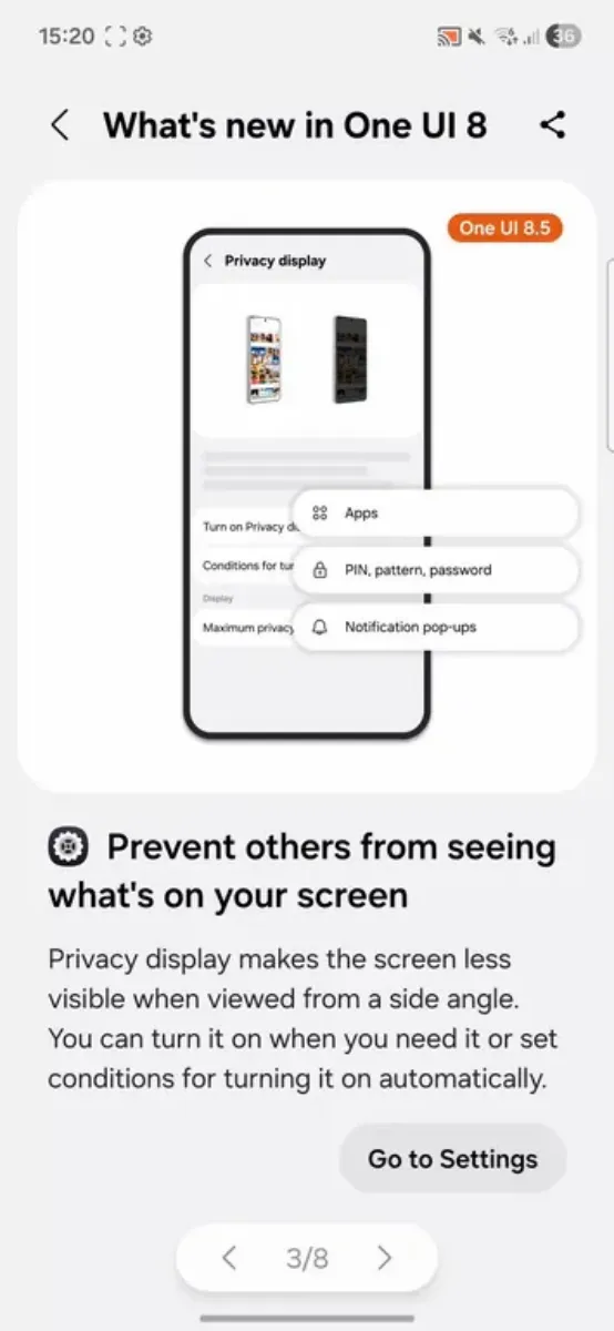 به‌گفته وب‌سایت SammyGuru، گزینه‌ای مربوط‌به «نمایشگر حریم شخصی» در اپلیکیشن به‌روزرسانی‌شده Tips سامسونگ پنهان شده است. این رسانه ادعا می‌کند که با شبیه‌سازی یک دستگاه به‌عنوان گلکسی S26 اولترا، توانسته به این صفحه دست پیدا کند.