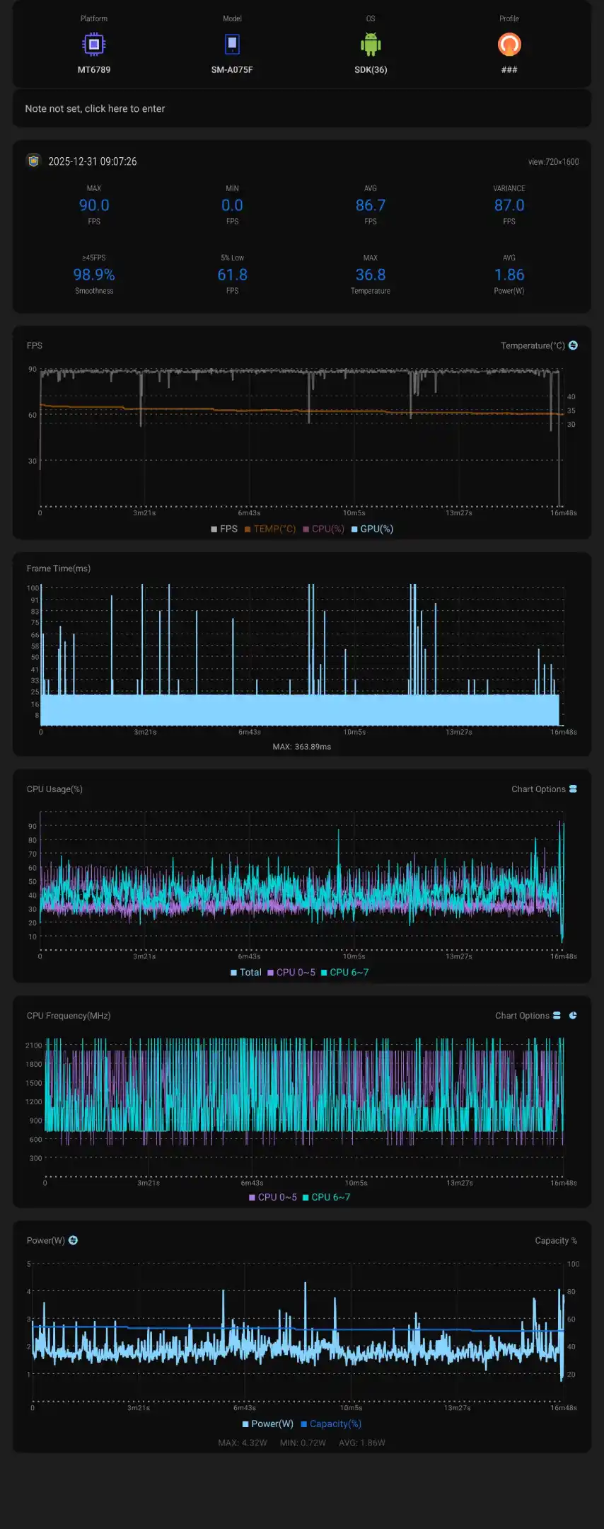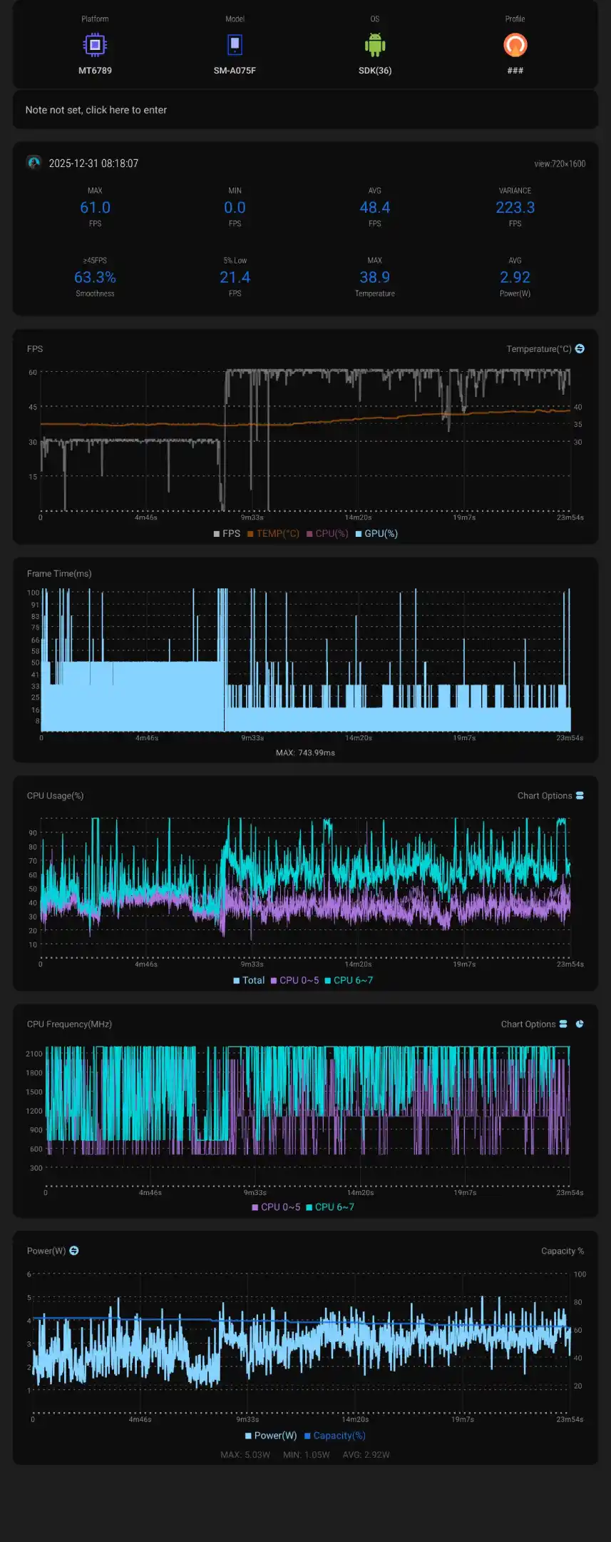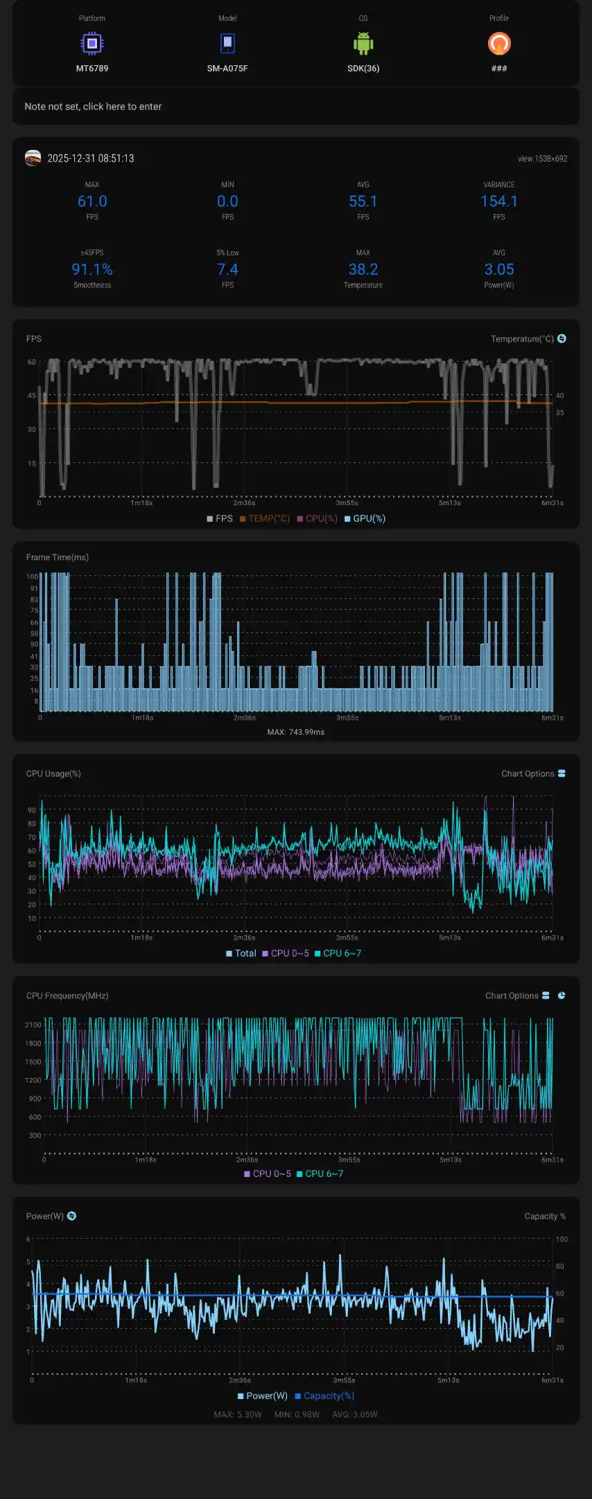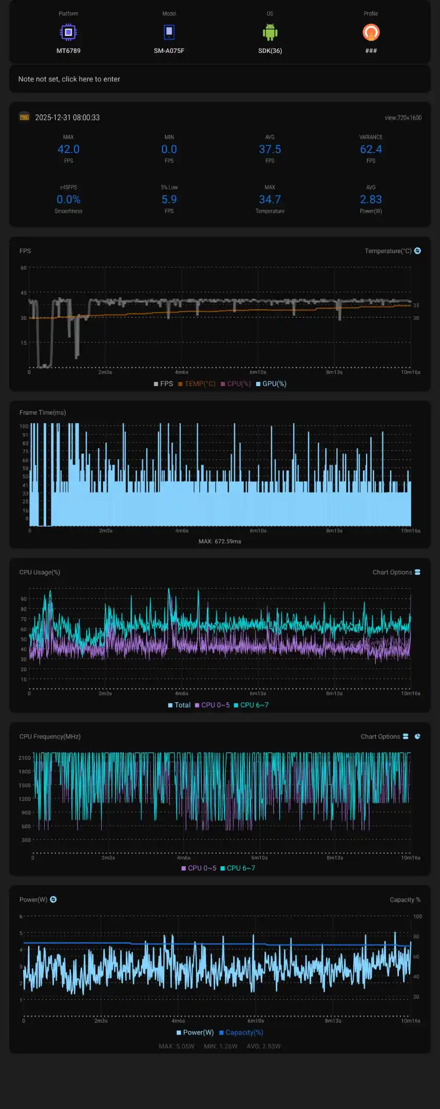 اجرای این عنوان کنسولی روی یک گوشی اقتصادی بیشتر شبیه به یک شوخی تکنولوژیک است تا تست واقعی! اما هدف ما دیدن مرز توانایی دستگاه بود. همانطور که دادهها نشان میدهند، دستگاه عملاً ناتوان بود، اما نکته مثبت اینجاست که حتی زیر این فشار خردکننده، دما از ۳۷ درجه عبور نکرد.