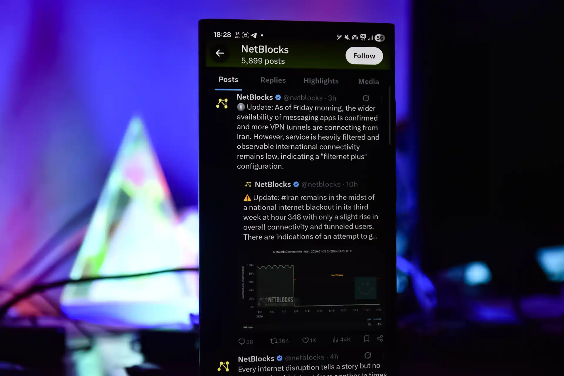 «بهروزرسانی: #ایران در سومین هفته خود در ساعت ۳۴۸ همچنان در میانه قطعی ملی اینترنت قرار دارد و تنها افزایش جزئی در اتصال کلی و کاربران متصل به تونل وجود دارد. شواهدی وجود دارد که تلاشی برای تولید ترافیک جعلی و ساختن روایتهایی از بازگشت گسترده اینترنت انجام شده است.»