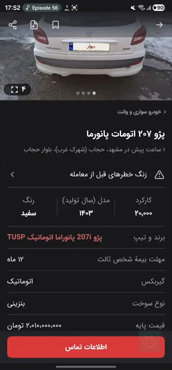 🔹 قیمت پژو ۲۰۷ اتوماتیک سقف شیشهای در آگهیهای فروش به ۲ میلیارد تومان رسیده است.