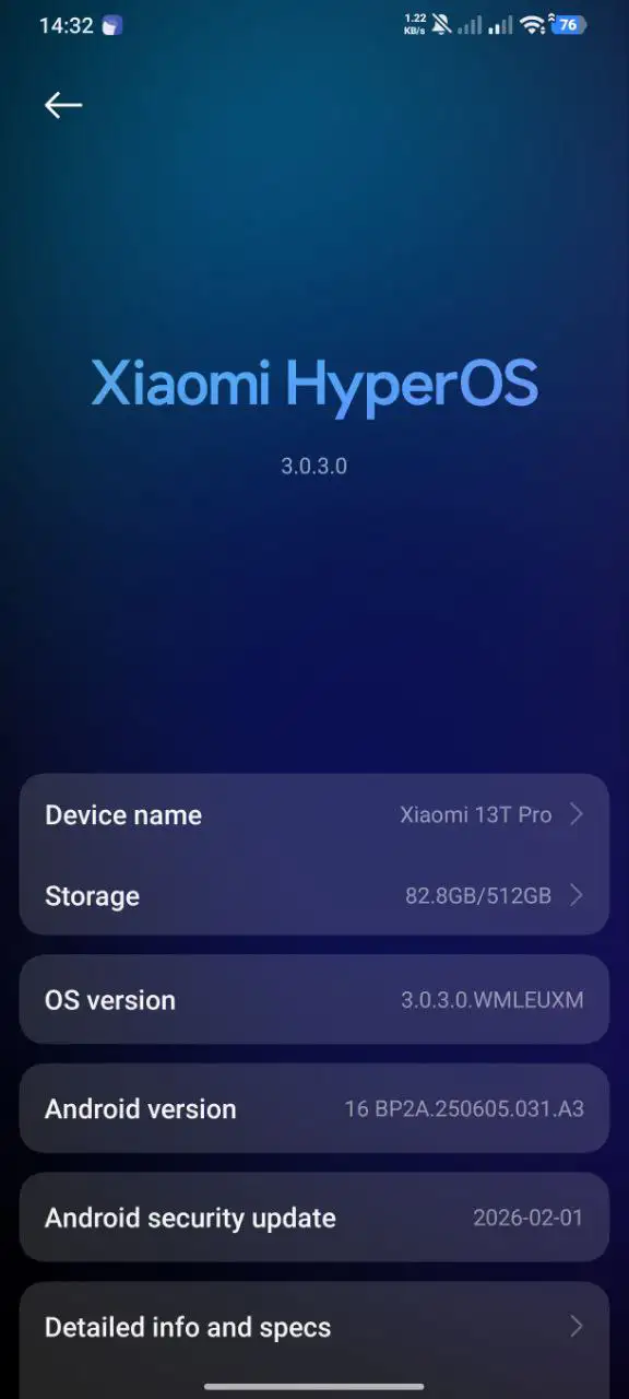 برای کاربرانی که از نسخه استاندارد شیائومی 13T استفاده می‌کنند، فرآیند به‌روزرسانی هنوز در جریان است. این دستگاه درحال‌حاضر در مرحله «بتای داخلی» برای ادغام با اندروید 16 قرار دارد. انتظار می‌رود نسخه پایدار عمومی طی هفته‌های آینده و پس از تکمیل مراحل اعتبارسنجی منتشر شود.