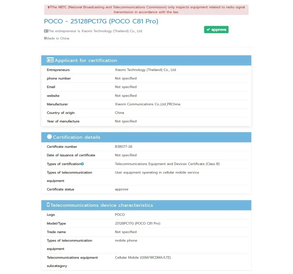پوکو C81 Pro در میان دادهای تأییدیه NBTC