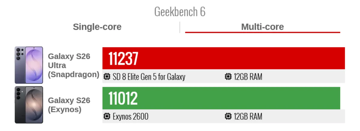 بنچمارک گلکسی S26 و S26 اولترا تفاوت عملکرد دو تراشه اسنپدراگون 8 الیت نسل 5 با اگزینوس 2600 را نشان می‌دهد