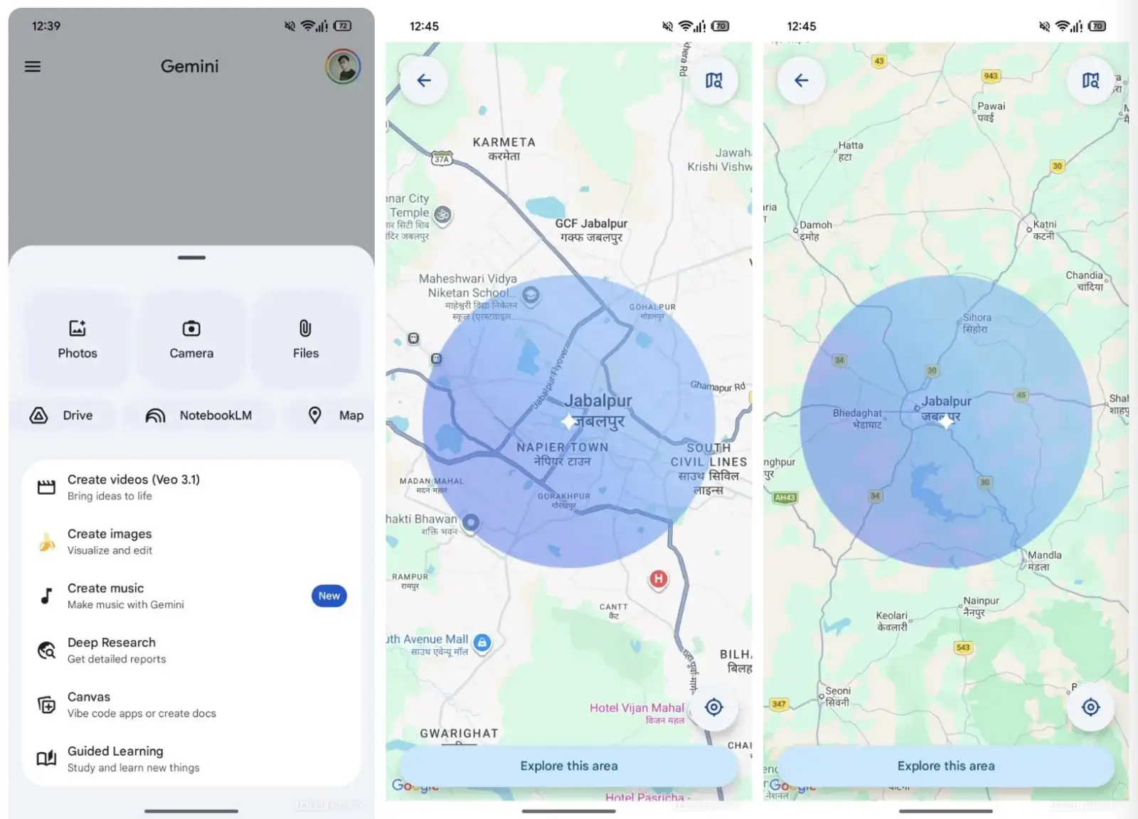 گزارشها حاکی از آن است که در نسخه ۱۷.۶.۵۸.ve.arm64 اپلیکیشن گوگل، یک گزینه جدید با نام Maps (نقشهها) در منوی پیوستهای جمینای اضافه شده است. لمس این گزینه، یک نمای تمامصفحه از نقشه را باز میکند که کاربران میتوانند بهراحتی روی آن زوم کرده، یک منطقه را انتخاب کنند و سپس دکمه Explore this area (کاوش در این منطقه) را فشار دهند. پس از آن، منطقه انتخابشده بهعنوان یک Map area (محدوده نقشه) به درخواست کاربر پیوست میشود.