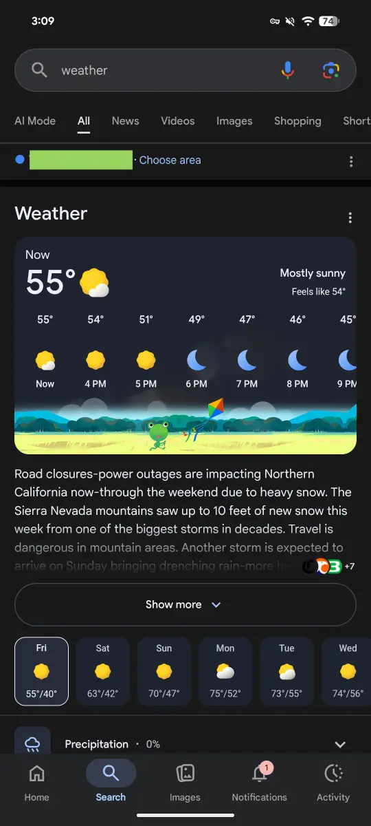 🔹 قورباغه معروف گوگل همچنان در طراحی جدید حضور دارد و پیشبینیها را نمایش میدهد.