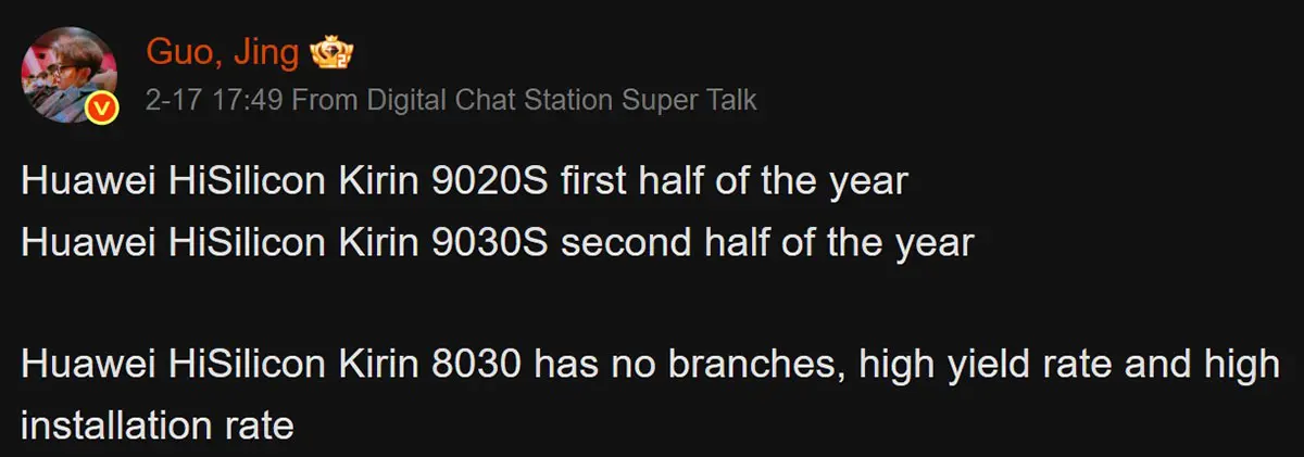 افشاگر یادشده پیکربندی پردازنده مرکزی (CPU) این تراشه‌ها را فاش نکرده است؛ اما به مدل دیگری اشاره کرده که مدت‌هاست در کانون شایعات قرار دارد: کرین ۸۰۳۰ (Kirin 8030). به‌گفته وی، این تراشه جدید دارای نرخ بازدهی تولید بالایی است و عملکردی بسیار بهبودیافته را ارائه خواهد داد.