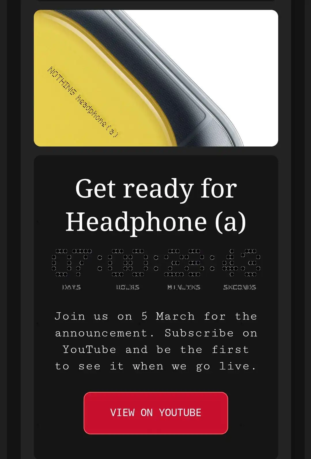 در یک تیزر بسیار کوتاه و مرموز، ناتینگ اعلام کرده است که هدفون جدیدش در تاریخ ۵ مارس (۱۴ اسفند)، دقیقاً در کنار سری گوشی‌های Nothing Phone (4a) روانه بازار خواهد شد. این شرکت در ایمیلی به رسانه‌های معتبر راجع‌به این محصول جدید نوشت: